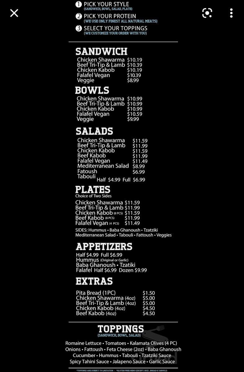 Salad Lovers Favorite Halal Beef Tri-tip Build your own with our amazing veggie toppings and sauces with your choice of Pita Bread or chips
